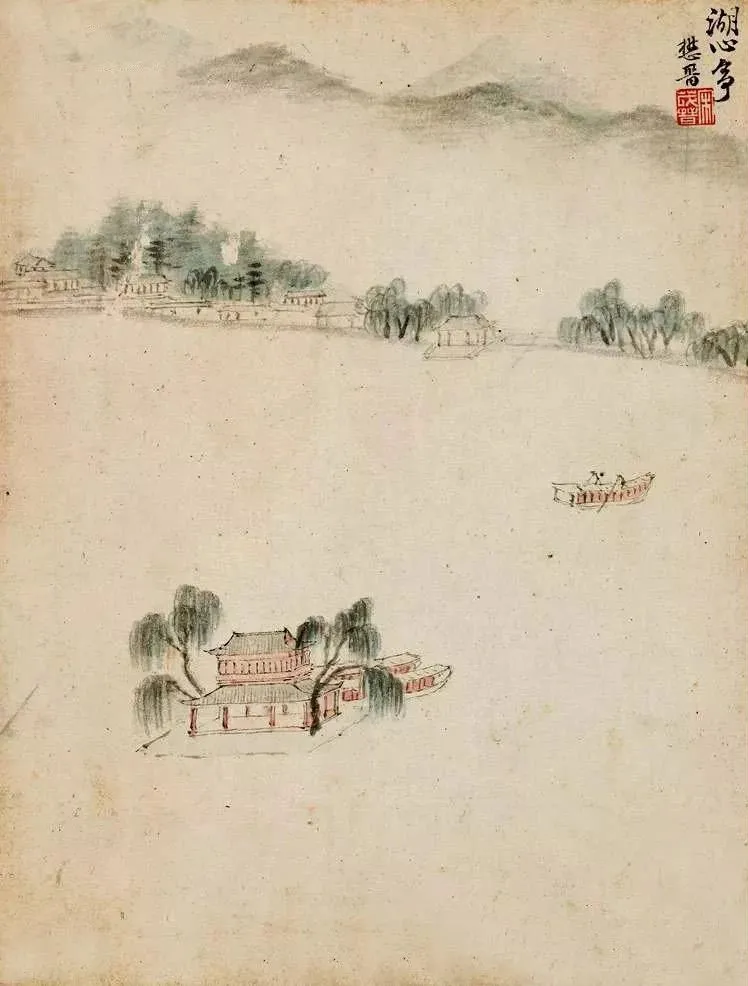 湖心亭:湖心亭位于西湖中央,画作中通过巧妙的构图和细腻的笔触,将湖心亭的孤独与宁静表现得淋漓尽致。