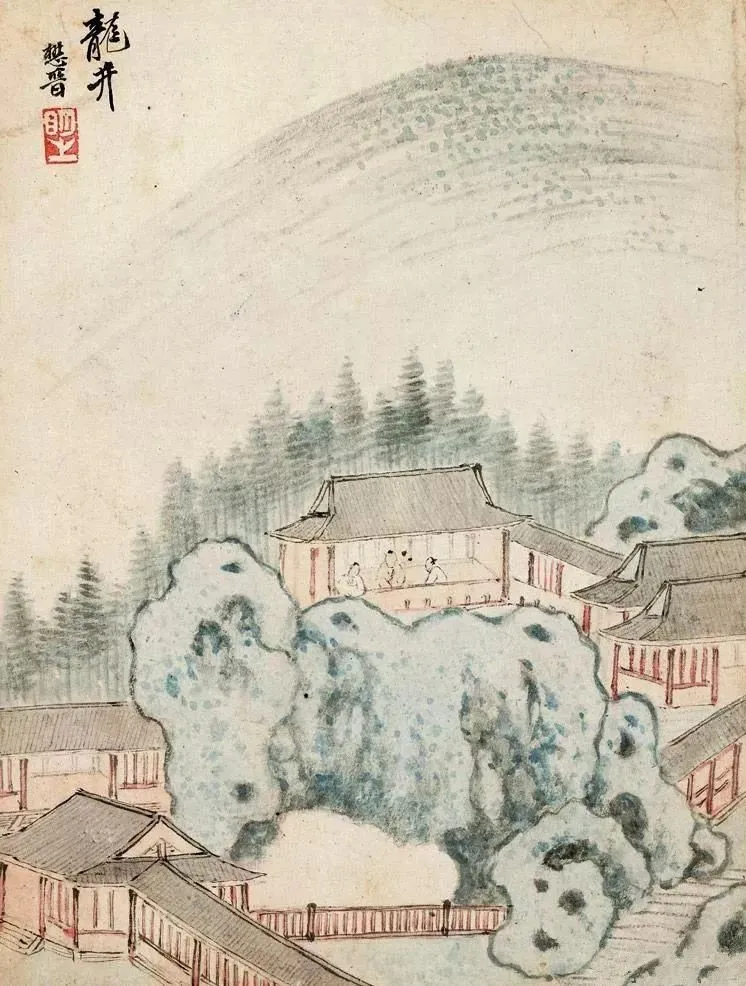 万松岭:万松岭上松树密布,画作中通过浓淡相宜的墨色和流畅的线条,将万松岭的苍翠与生机表现得栩栩如生。