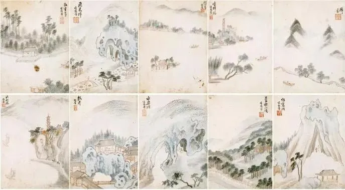 《西湖胜迹图册》中的十幅画作,分别描绘了西湖周边的著名景点,包括雷峰塔、湖心亭、放鹤亭、万松岭、飞来峰、两峰、六和塔、龙井、烟霞洞、水乐洞等。每一幅画作都力求精准地捕捉景点的神韵,通过细腻的笔触和丰富的墨色变化,将西湖的美景生动地呈现在观者面前。